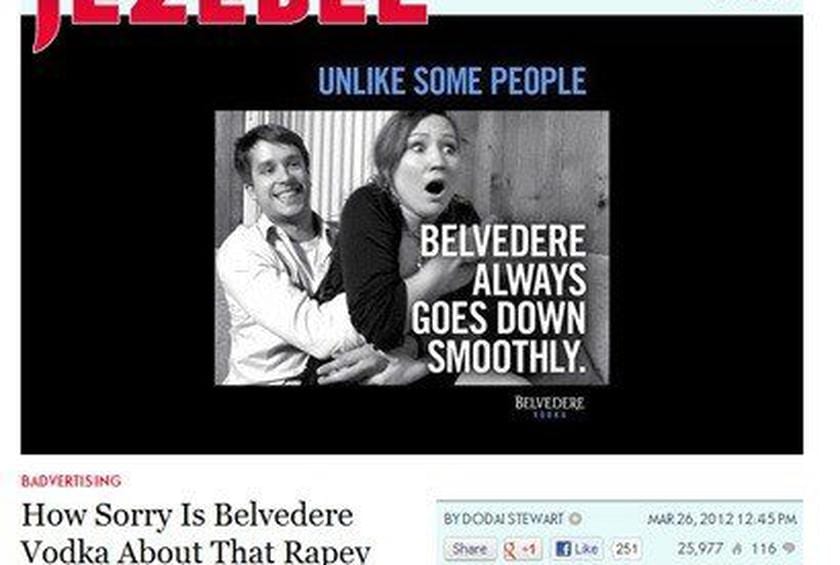 Two weeks ago, Belvedere Vodka tweeted an ad depicting a man pulling a surprised, open-mouthed woman down onto his lap. The headline read: “Unlike some people, Belvedere always goes down smoothly.” Decent people got the skeevies and called the ad out as rapey. Belvedere quickly tweeted that they were sorry “if any of our fans were offended” — but not sorry for the actual creepy ad — and made a donation to the Rape And Incest National Network.