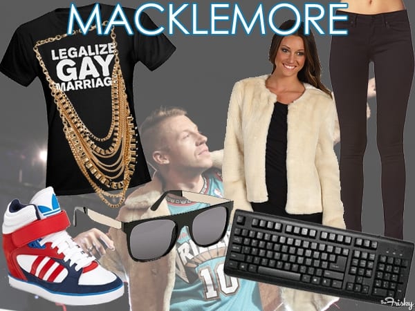 If you really want your Macklemore costume to be authentic, you would purchase all of the elements from your local thrift shop. All you need is a faux fur coat, either a pro-gay marriage T-shirt (a reference to his song “Same Love”) or a sports Jersey (the Bulls or Sonics or Celtics), gold chains, high top kicks, black jeans and cool shades. Cheat the hair — no need to shave the sides — by pulling the sides of your hair back really tight, pompadour-ing the middle section, and tying it back into a bun. BOOM. America’s hottest white rapper right now. Get the deets on the non-thrifted pieces above after the jump!