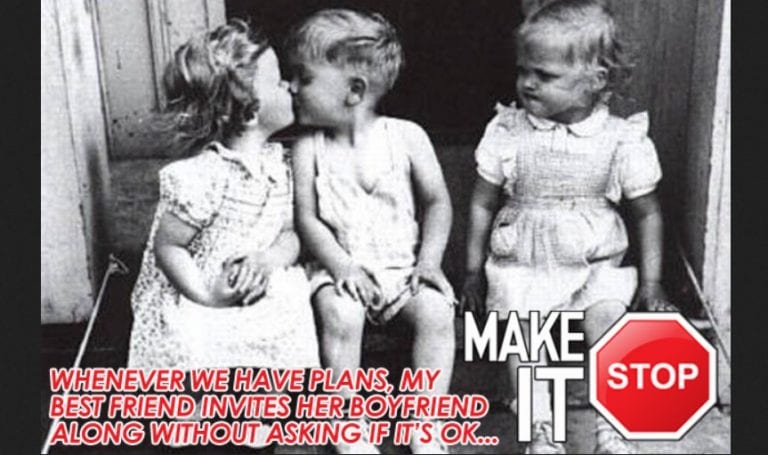 What a letdown. She’s trying to cram best friend-time into boyfriend-time and that’s not fair to you. Especially if you were looking forward to dishing the dirt about last week’s one-night stand but he keeps interrupting right when you’re getting to the juicy part of the story. No one wants to feel like the third wheel in their own friendship.