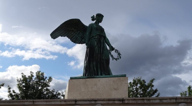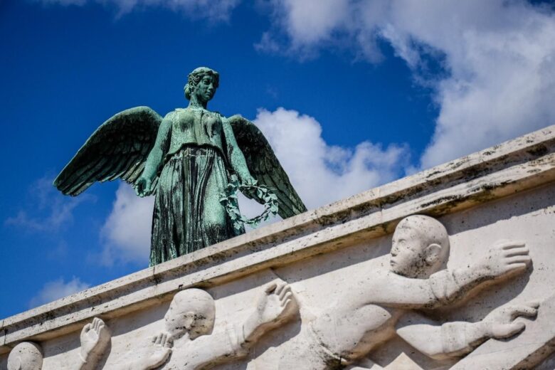Crowning the marble plinth, a bronze angel looks out over the water with serene composure. Her wings, broad, protective, and graceful, seem to gather up the hopes and sorrows of the city. In her outstretched hand, she holds a laurel wreath, a classical symbol associated equally with peace and victory.