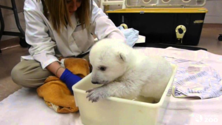 The Toronto Zoo’s new baby polar bear took his first bath, everyone! His resemblance to a real-life teddy bear makes him too precious to handle. This little cutie was born to his mama bear, Aurora, on November 9 and he doesn’t have a name yet. I’m going to assume that this is because the zoo staff hasn’t found a moniker that fits his personality just yet. After all, he hardly looks like he could be a Fred or a Joe — he needs something a little more exotic to match his Arctic roots. His two brothers did not survive the first two days after their birth, and when he began to appear weak himself, he received extra food and assistance from the staff. If his adorableness factor is any sign of how healthy he is, it’s safe to say that he’s doing quite alright.